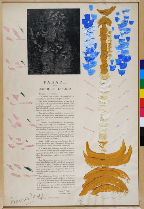 2015 006: Francis Ponge. Parade pour Jacques Hérold - Poem poster 1954 (Jacques Hérold illuminated Francis Ponge's text with watercolours)