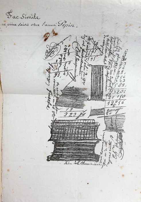 Librairie BERTRAN - Photos d'un carnet d'une centaine de croquis d'audience de la première partie du XIXème, pris à la Cour des pairs - la machine infernale de l'attentat du 28 juillet 1835